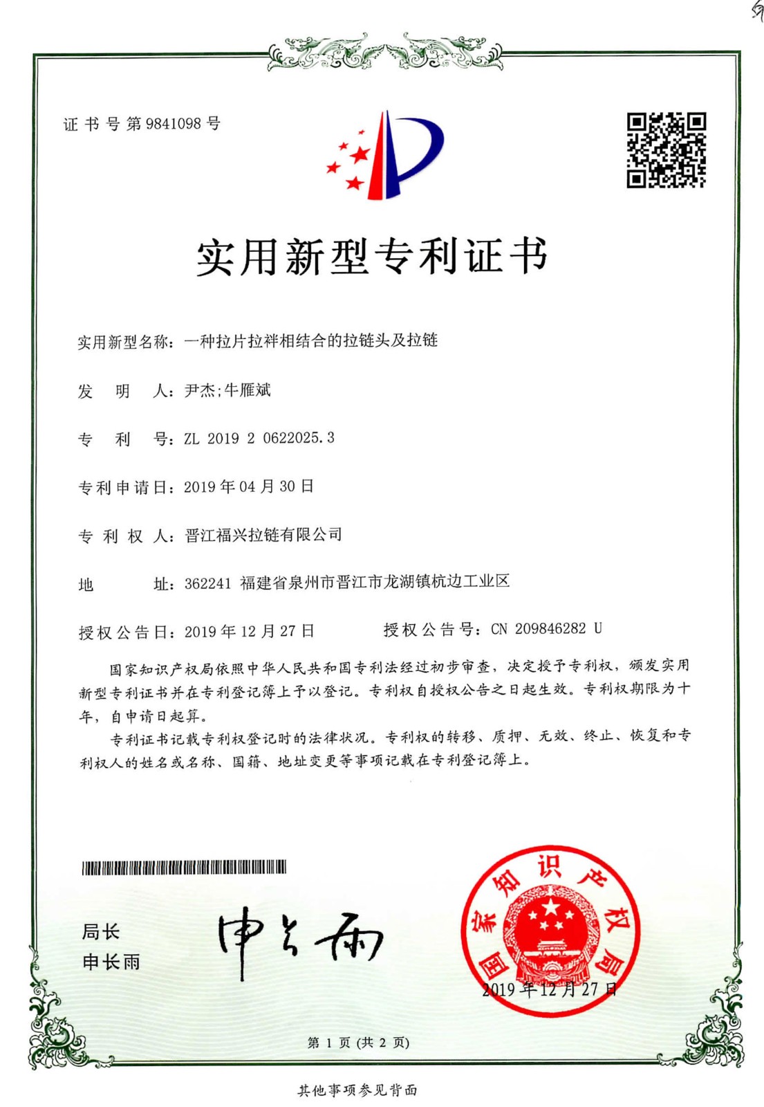 实用新型发明专利(第9841098号)