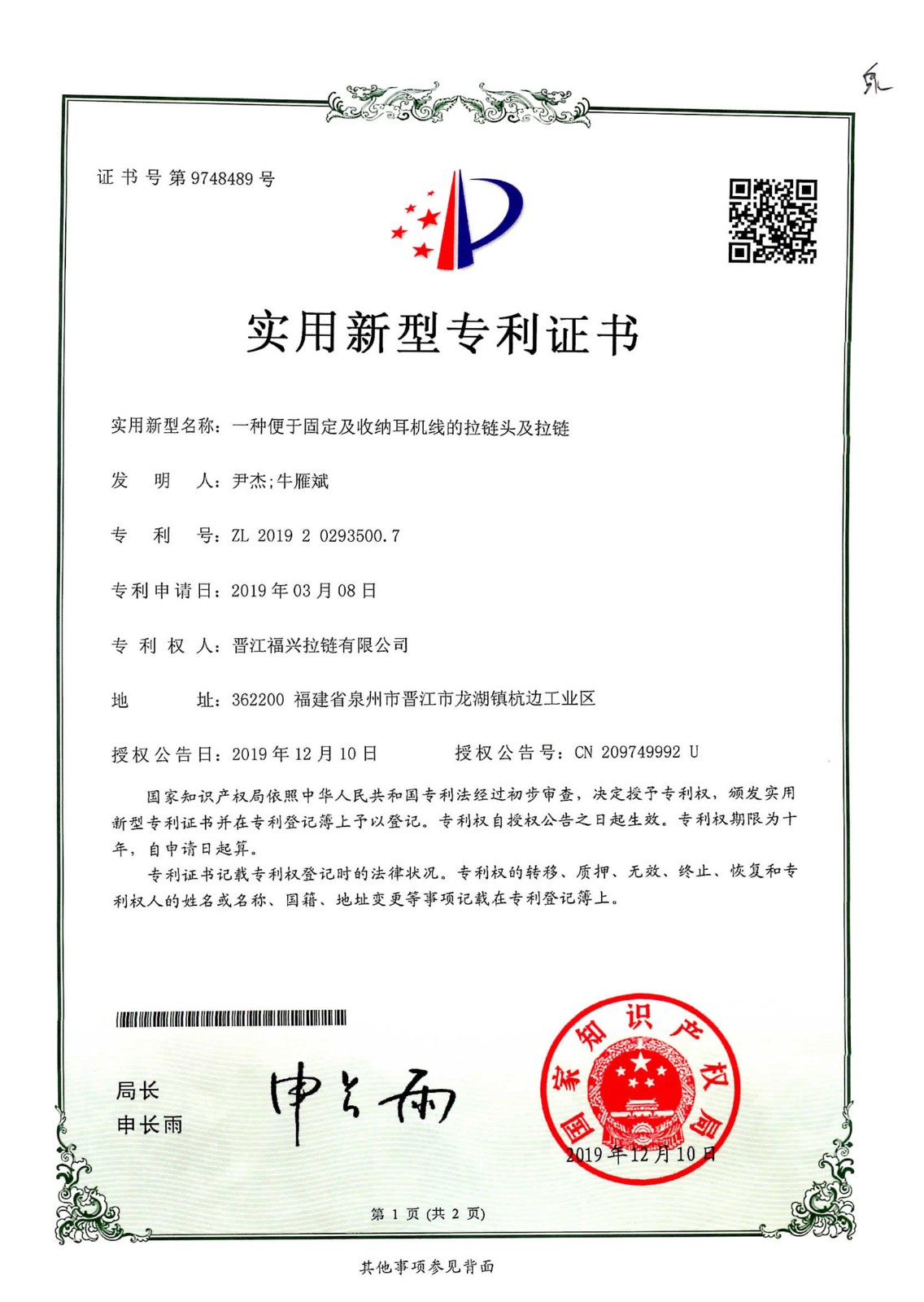 实用新型发明专利(第748489号)
