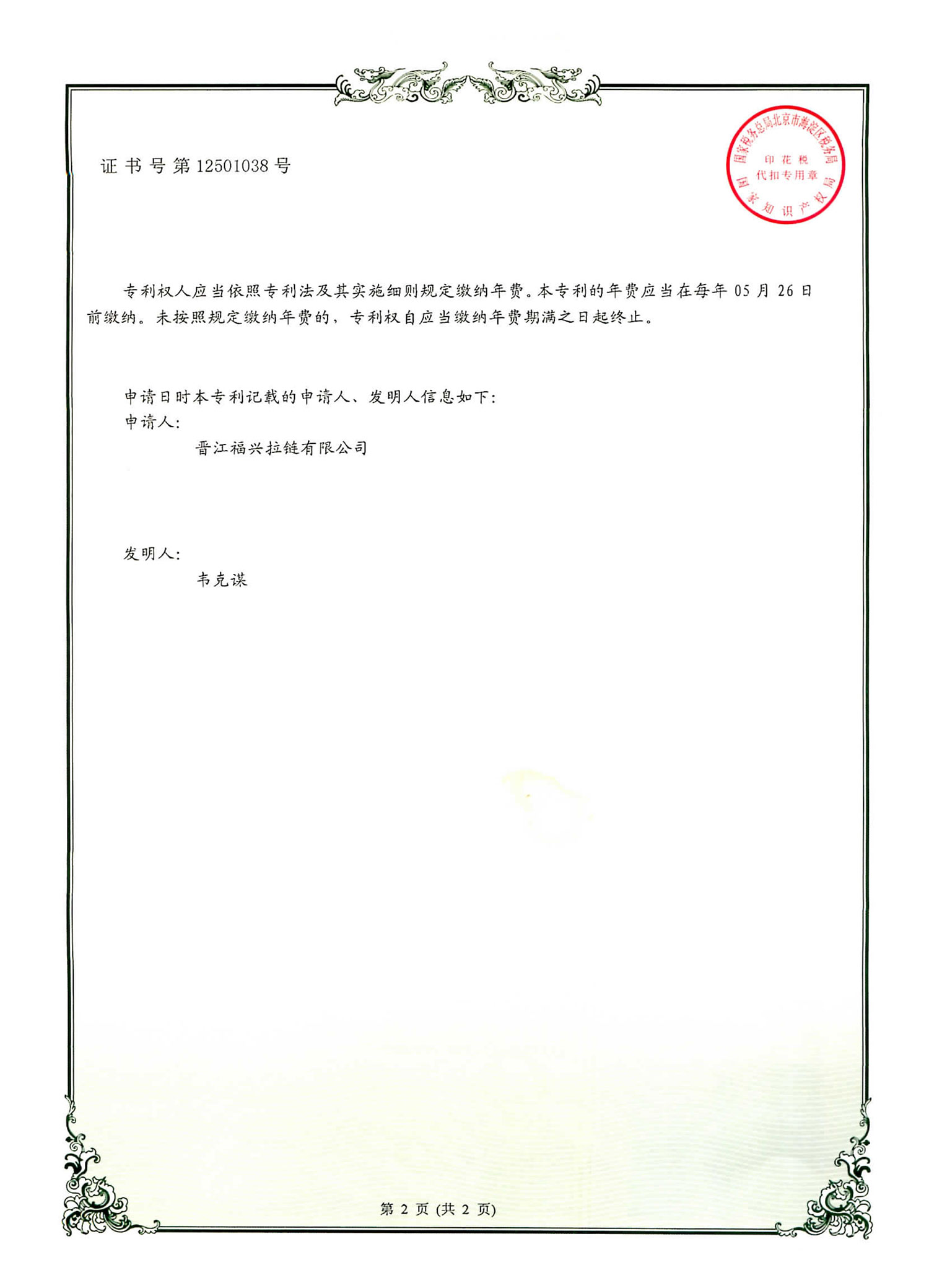 实用新型发明专利(第12501038号)
